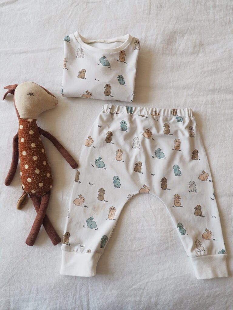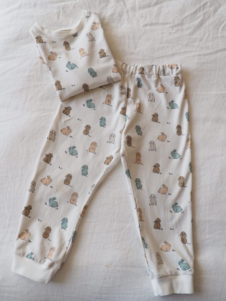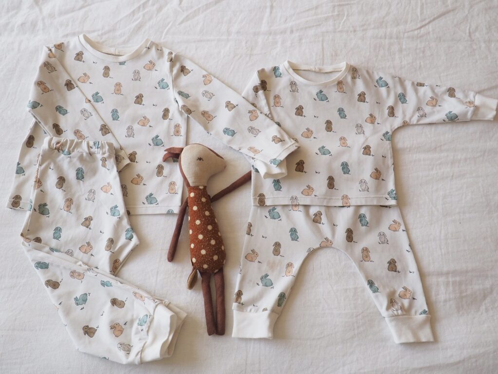 Je rêvais de coudre ce duo pour les enfants depuis la naissance de Noé il y a un peu plus d’un an. Un ensemble de petits pyjamas en jersey rigolo pour voir mes deux pioupious assortis le temps de la nuit et des dimanches matins à traîner à la maison. J’ai donc choisi un joli jersey chez Ikatee et j’ai optimisé mon coupon au maximum pour caler mes deux pyjamas dans un coupon de 1,60 m x 1,60 m. Puis je me suis lancée dans ce double projet tellement satisfaisant à coudre que je prévois de remettre ça prochainement !
