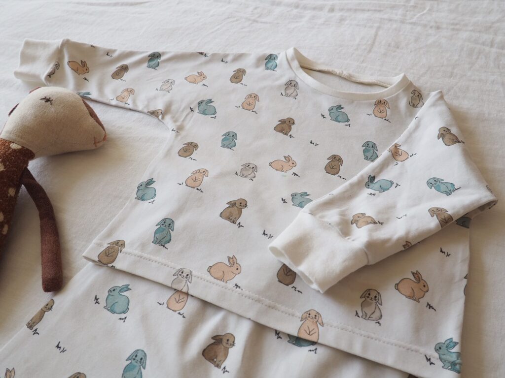 L’avantage de ce modèle c’est qu’il est vraiment rapide à coudre : 2 pièces pour le haut + les poignets et l’encolure en bord-côte et idem pour le bas. En à peine une soirée, l’ensemble est cousu !