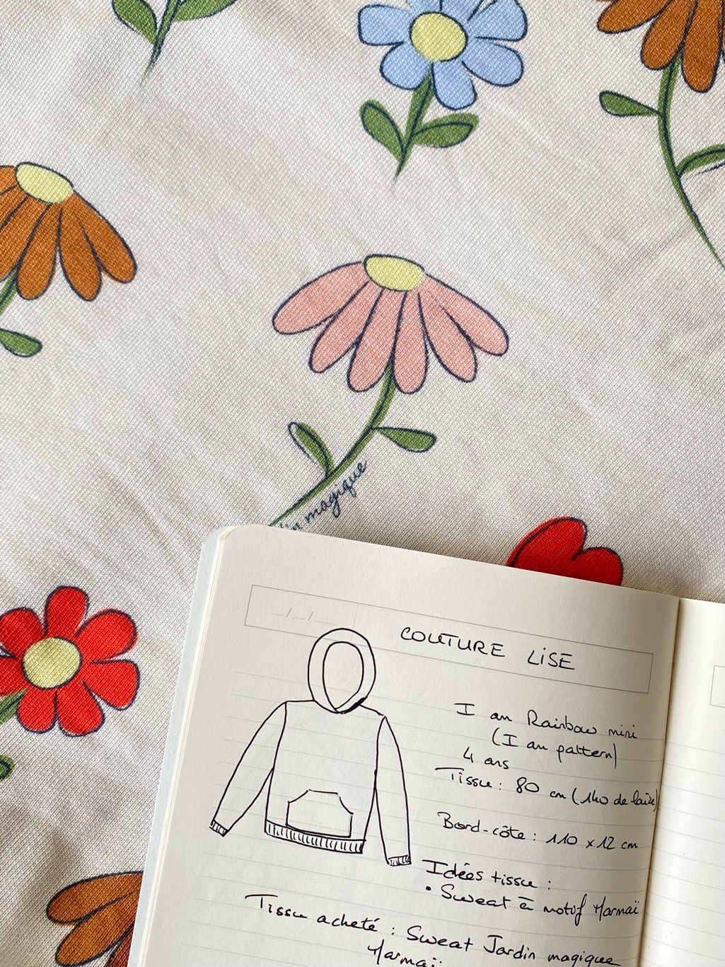 Après le succès de son premier sweat à zip I am rainbow mini, Lise avait envie d’un nouveau sweat “avec une grande poche où les mains se touchent et une capuche”. On avait donc regardé ensemble les tissus sur le site de Marmaï et elle avait choisi un molleton fleuri d’une précédente collection.