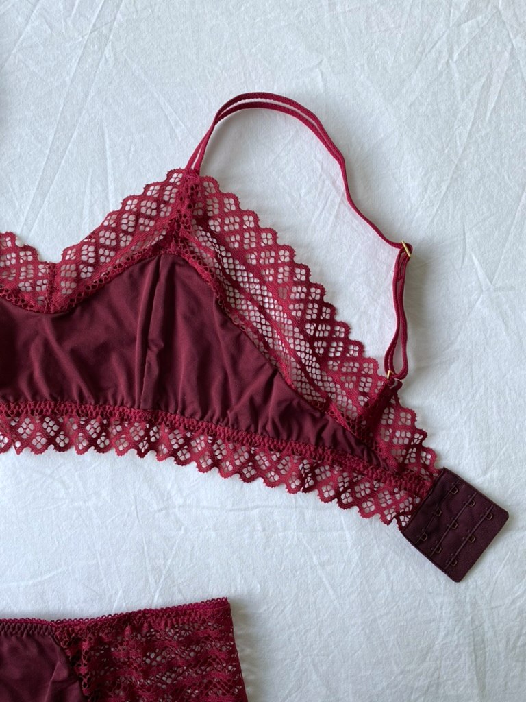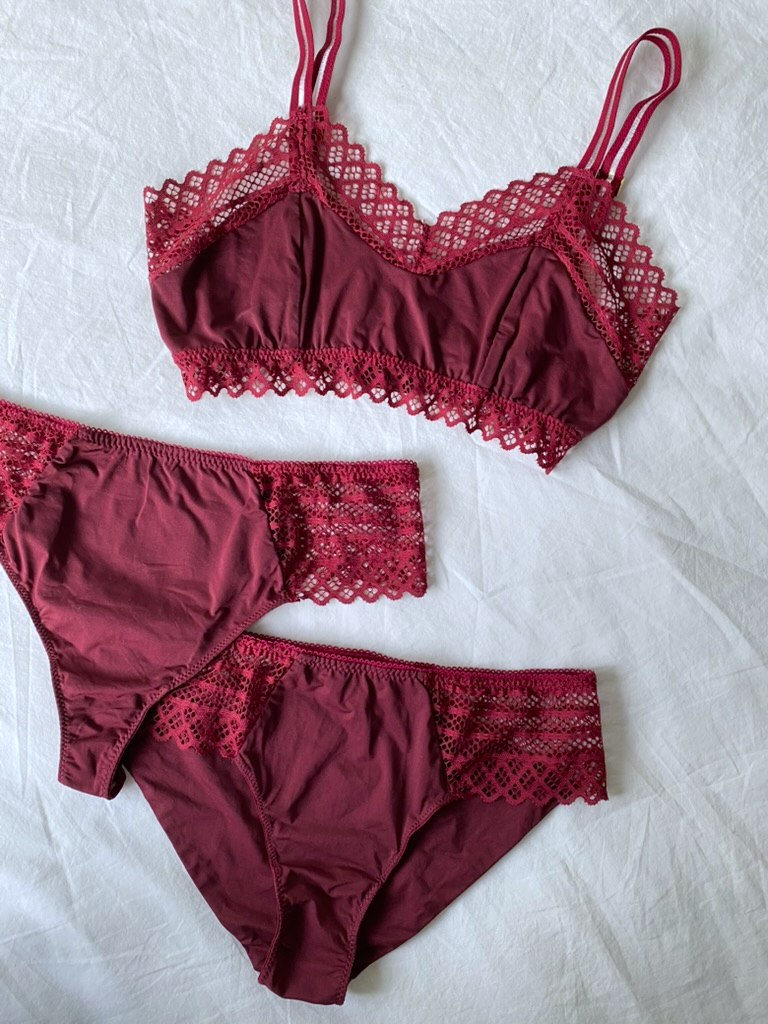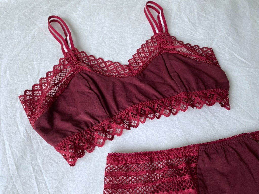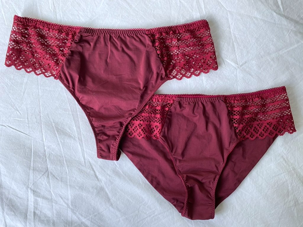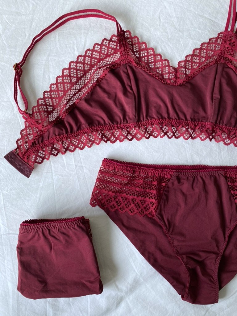 Sorti il y a 3 ans (déjà !), j’avais tout de suite aimé cet ensemble composé d’une brassière et d’une culotte ou d’un tanga dans un mélange de microfibre et de dentelle bordeaux. J’avais donc acheté le coffret dès sa sortie et puis, rattrapée par ma liste de projets à rallonge, je l’avais laissé de côté. Mais avec sa belle couleur bordeaux que l’on voit beaucoup cette saison, j’ai eu très envie de le coudre cet automne.